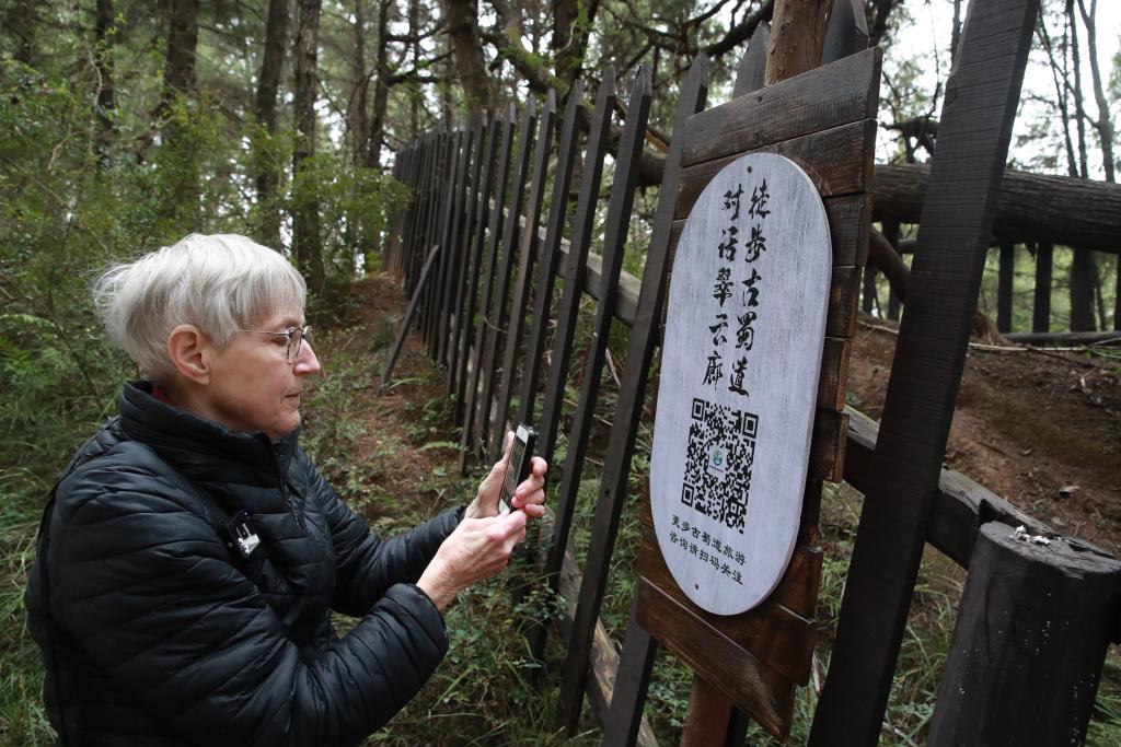 3月15日,賈和普在廣元市劍閣縣古蜀道用手機(jī)掃描銘牌上的二維碼。新華社發(fā) 劉仁 攝
