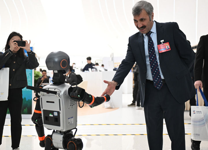 3月27日,2025中關(guān)村論壇年會與會嘉賓與一款加速T1機器人握手。新華社記者 張晨霖 攝