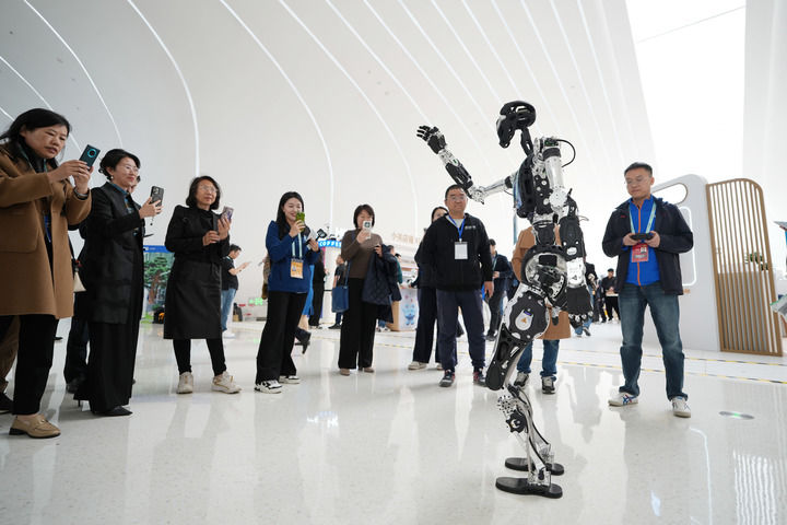 在中關(guān)村國際創(chuàng)新中心,一款名為“小關(guān)”的人形機器人向與會嘉賓招手(3月27日攝)。新華社記者 鞠煥宗 攝