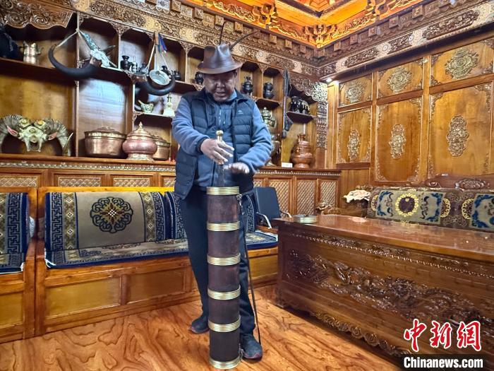 如今,這個陪伴了全家近四代人的老木桶,被鄭重地擺在客廳的陳列柜上。旁邊擺放著同樣年代久遠的老式秤和糌粑桶,三個老物件靜靜訴說著往昔的艱辛。“這些都是我父輩用的,我也喝過這個木桶打出來的茶。”米瑪頓珠說。