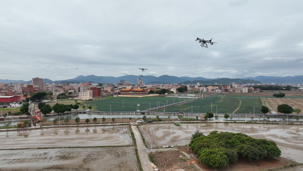 這是4月1日在福建南安拍攝的無人機吊運物資的畫面(無人機照片)。新華社記者 周義 攝