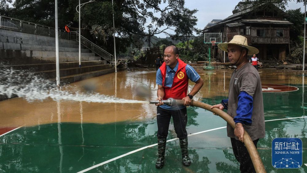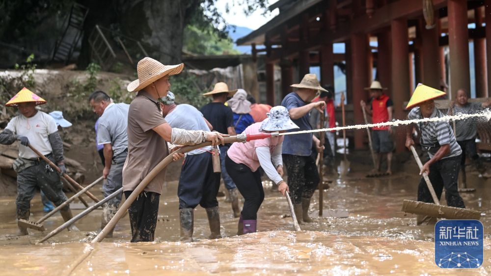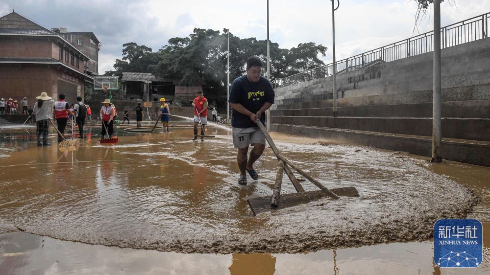 ↑6月26日,在三江侗族自治縣良口鄉良口村,志愿者和村民合力清理淤泥。