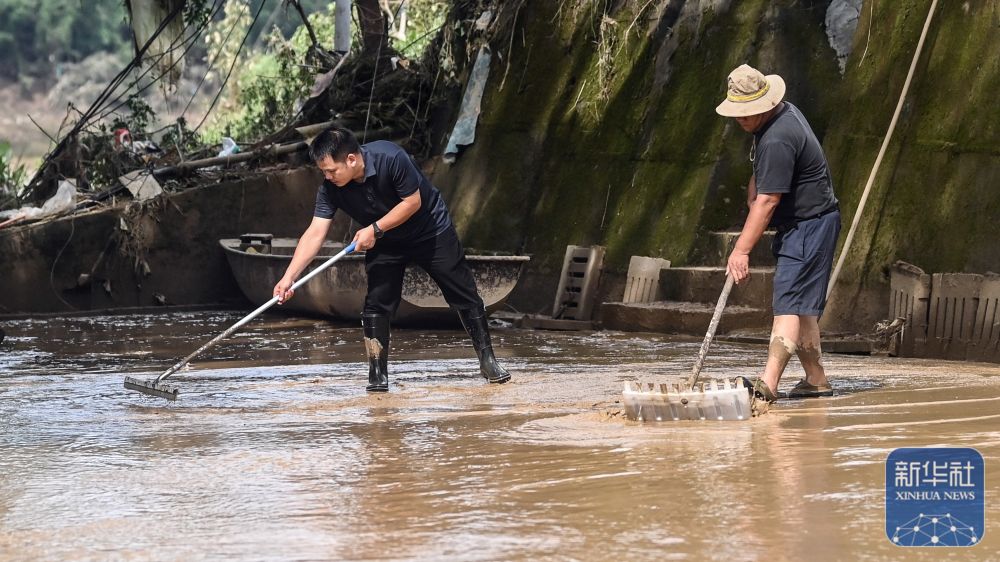 ↑6月26日,人們在三江侗族自治縣良口鄉良口村清理淤泥。