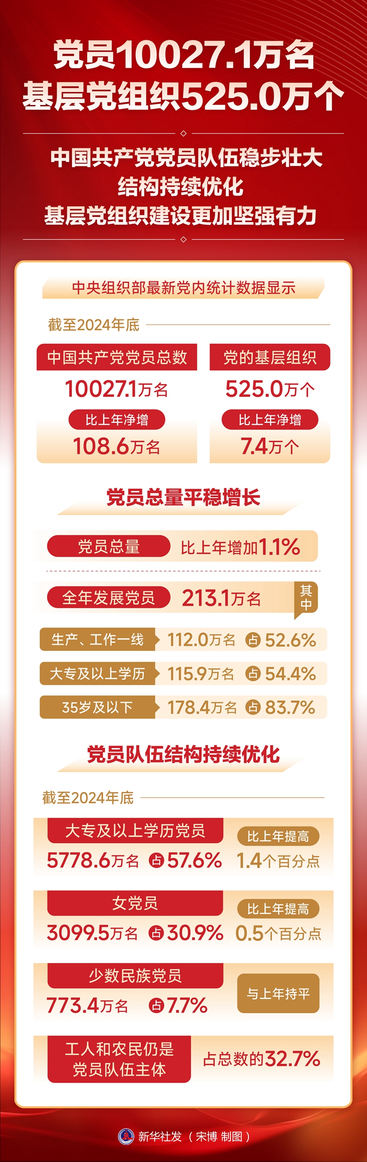 新華社北京6月30日電 中央組織部最新黨內統計數據顯示,截至2024年底,中國共產黨黨員總數為10027.1萬名,比上年凈增108.6萬名。黨的基層組織525.0萬個,比上年凈增7.4萬個。中國共產黨堅持用改革精神和嚴的標準管黨治黨,著力建強基層組織、鍛造過硬隊伍,為以中國式現代化全面推進強國建設、民族復興偉業提供堅強組織保證。