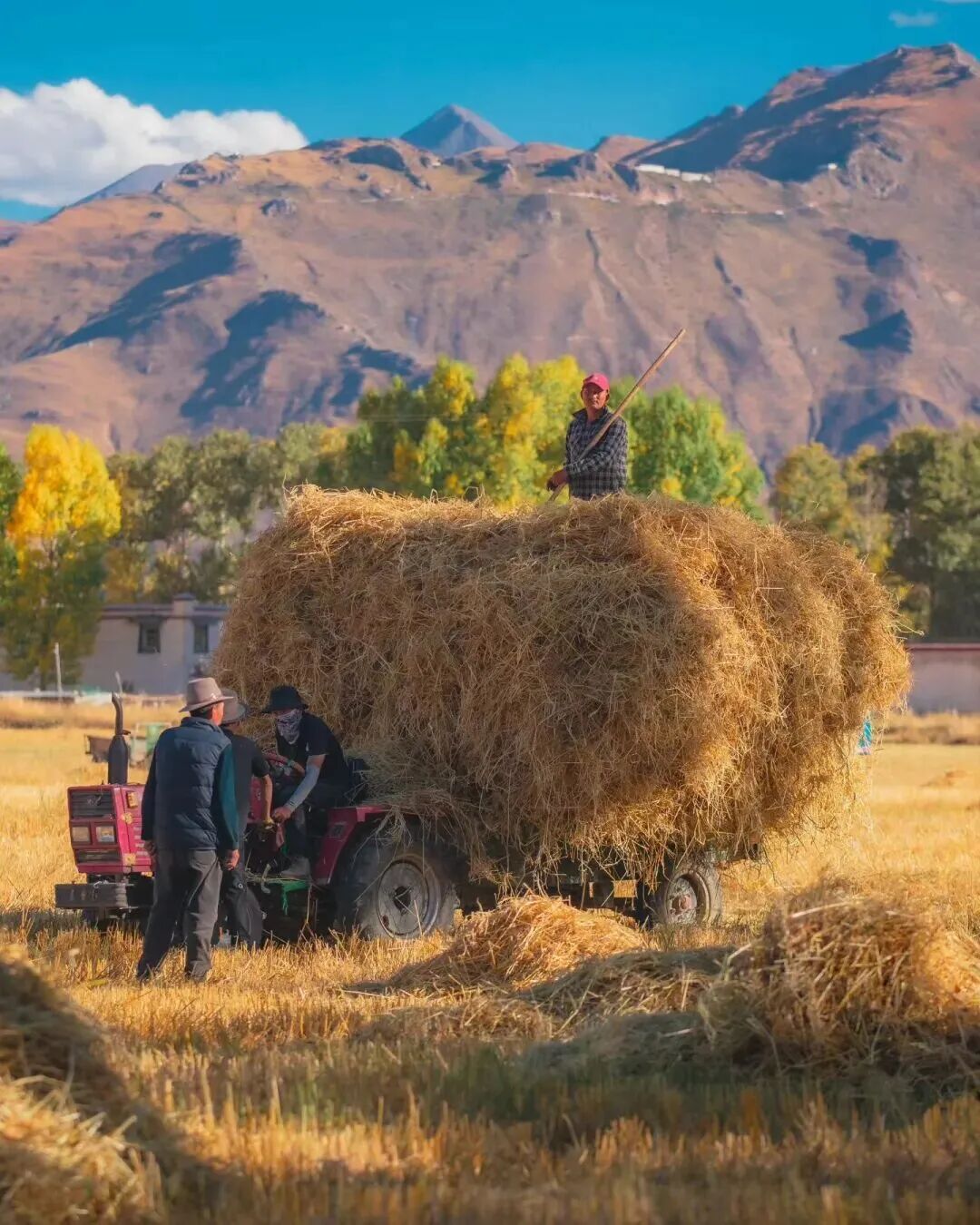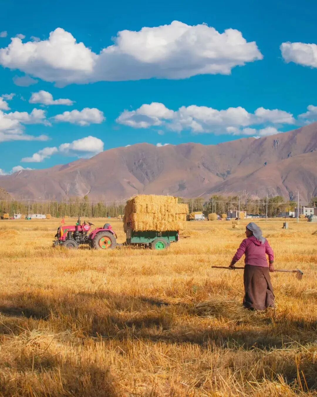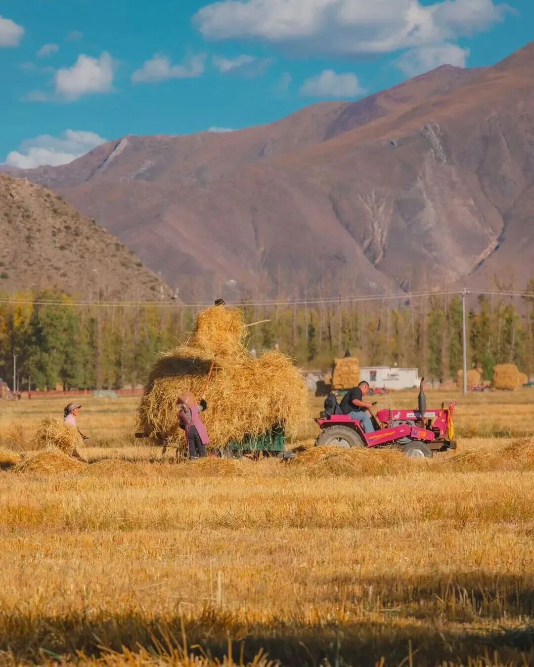 青稞草垛與密匝樹林的相配