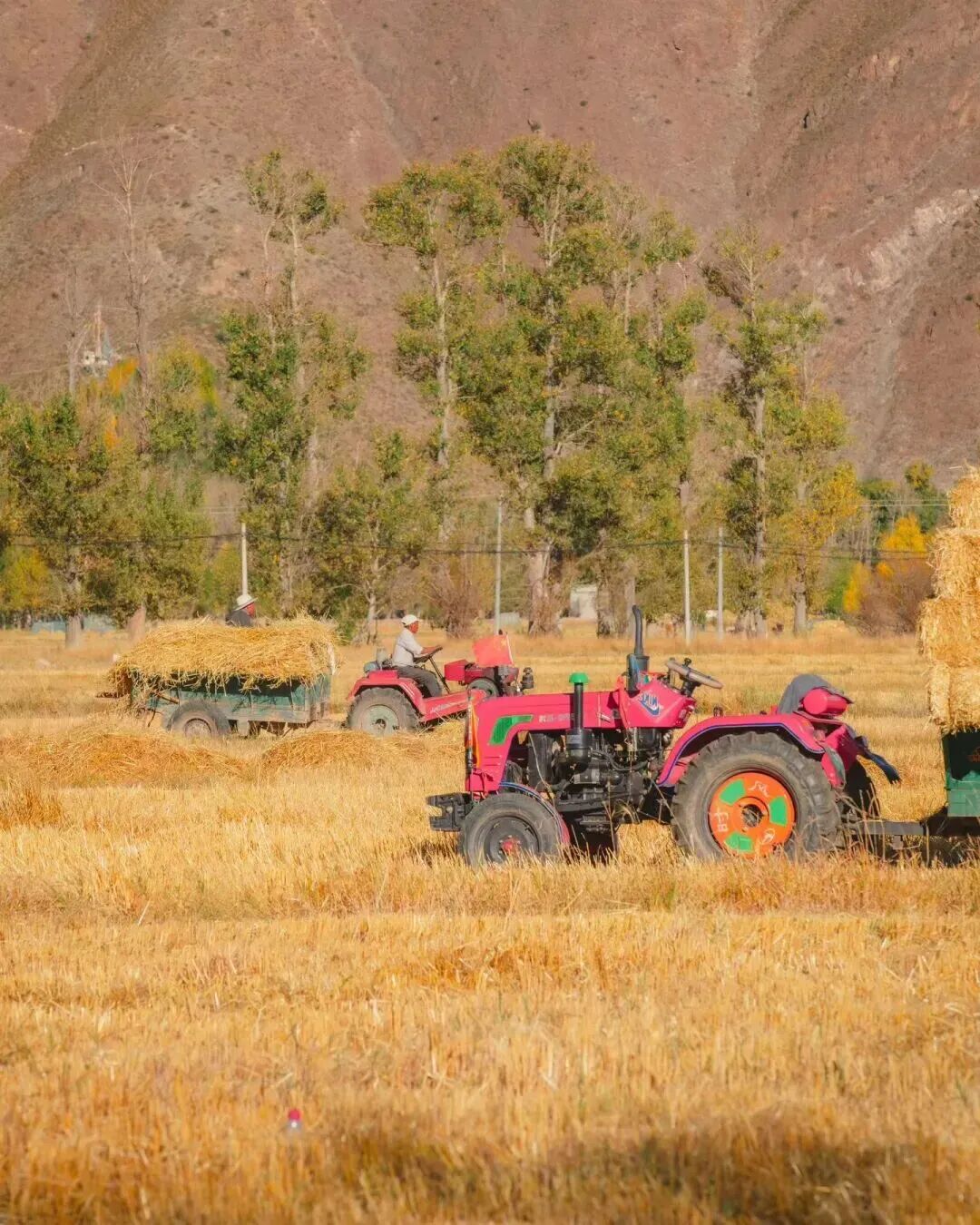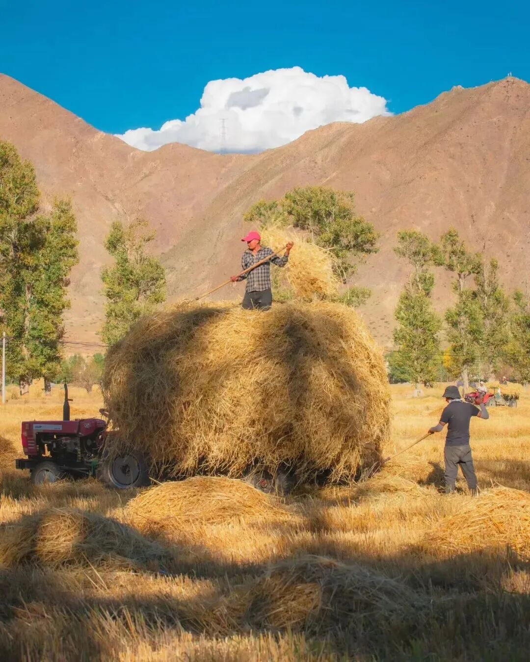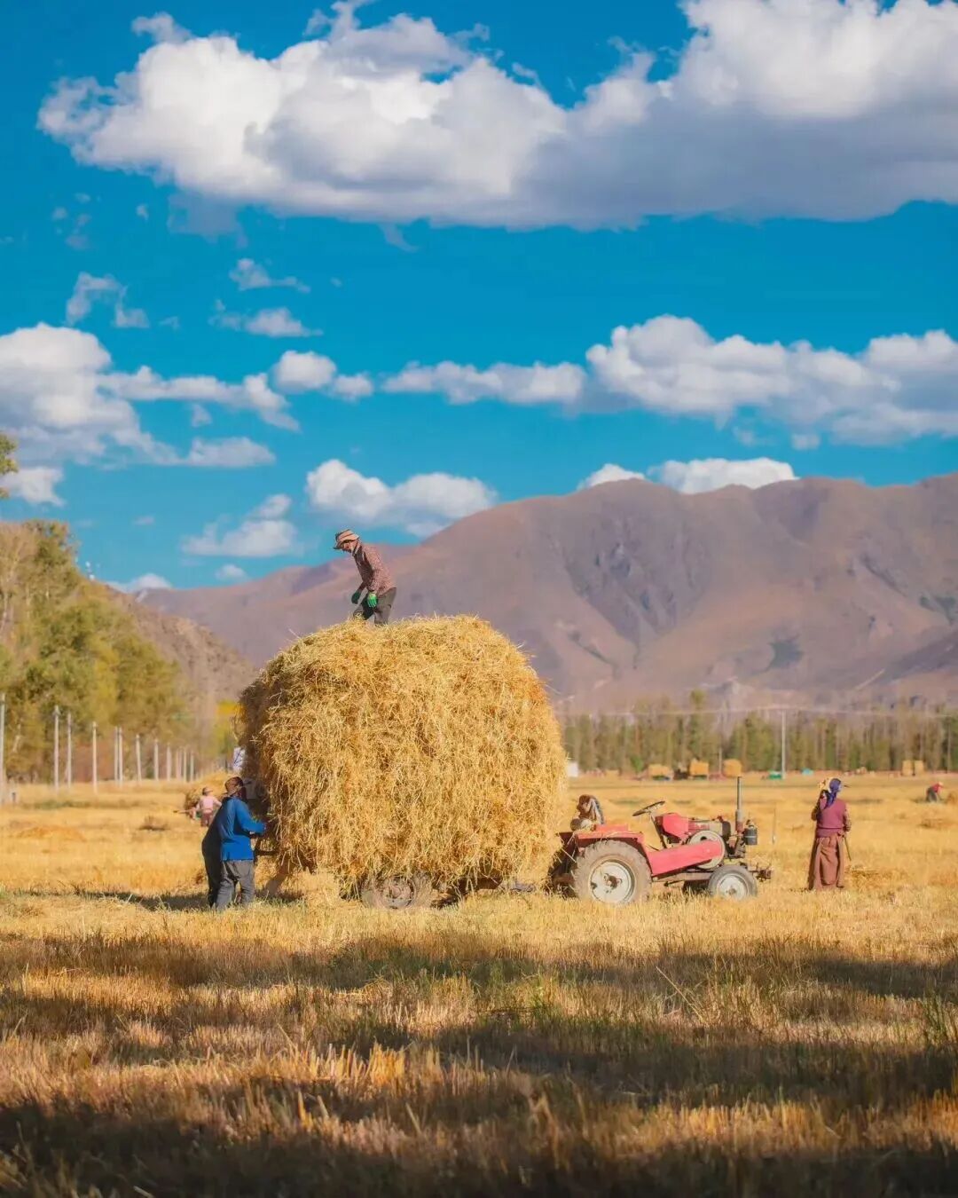 青稞草垛與密匝樹林的相配