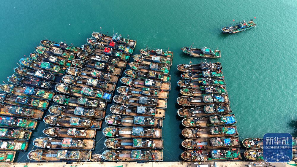 ↑ 12月11日,在山東青島西海岸新區積米崖漁港,漁船停靠在泊位上(無人機照片)。新華社發(俞方平 攝)