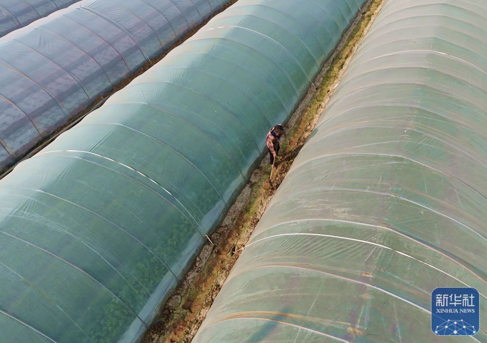 ↑ 12月10日,河南省南陽市新野縣城郊鄉呂莊村,村民在蔬菜種植基地對蔬菜大棚進行封土加固(無人機照片)。新華社發(高嵩攝)