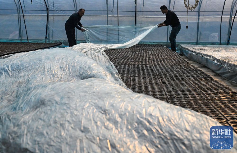 ↑ 12月11日,在河南省商丘市夏邑縣會亭鎮朱瓦房村大棚育苗基地,村民為剛剛下種的育苗苗床覆蓋薄膜保溫。新華社發(王高超攝)