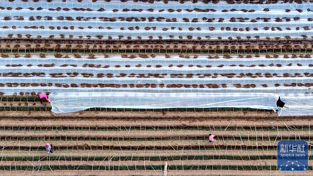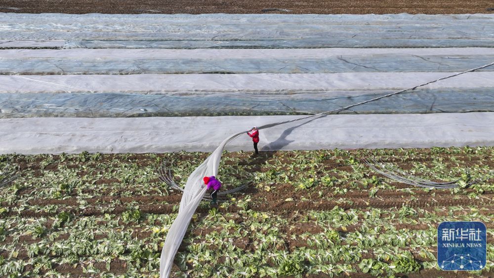 ↑ 12月11日,在山東省臨沂市平邑縣地方鎮,村民為種植的蔬菜幼苗覆蓋保溫薄膜(無人機照片)。新華社發(武紀全攝)
