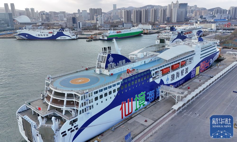 ↑ 12月11日,客輪在山東港口煙臺港停靠避風(無人機照片)。新華社發(唐克攝)