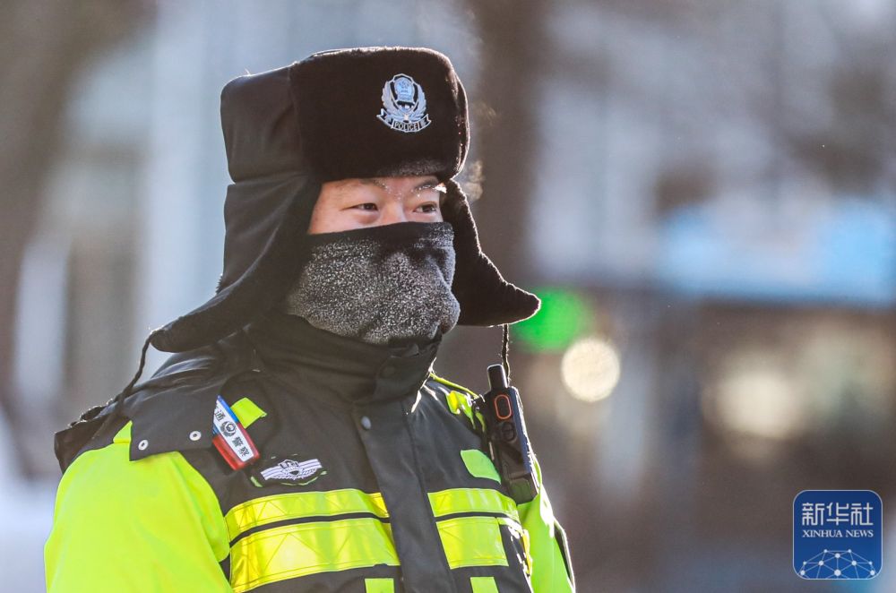 ↑ 12月11日,在黑龍江省伊春市伊美區,一名交警在寒潮中指揮交通。新華社發(李佳星攝)
