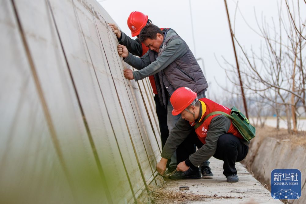 ↑ 12月10日,在河南省商丘市睢縣周堂鎮齊莊村有機蔬菜種植基地內,國網河南省電力公司睢縣供電公司“電力雷鋒”志愿服務隊志愿者幫助菜農加固蔬菜大棚。新華社發(徐澤源攝)