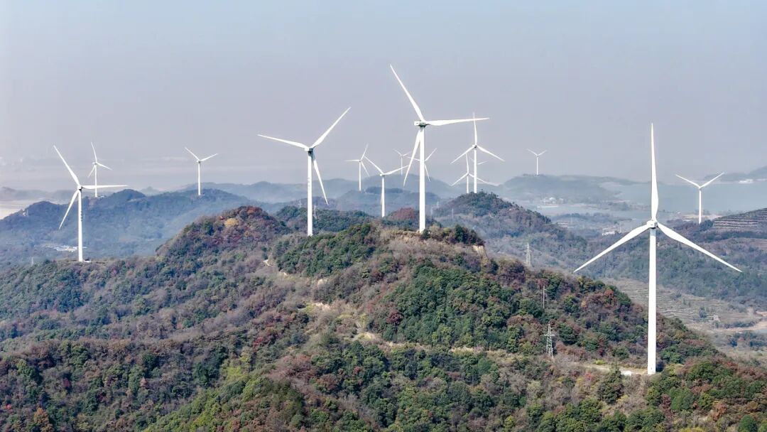 12月3日,在江西九江市湖口縣舜德鄉高橋村,風力發電機組矗立青山間,不斷輸送綠色清潔能源。張玉攝