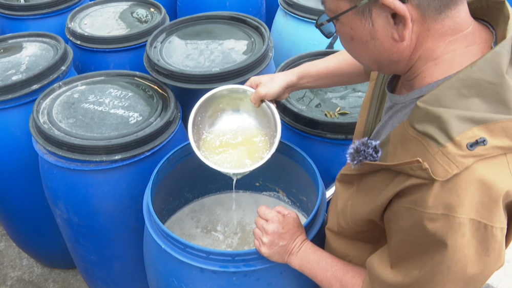 在香港元朗石湖圍新村,鴻日農莊主理人黃展明走進菜地,打開閥門,地上的黑色水管開始向紅葉生菜灑水。這不是普通的自來水,而是黃展明精心調配的三文魚骨酵素溶液。