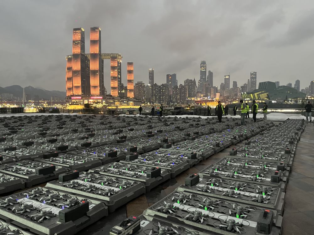 位于重慶市南岸區(qū)的重慶市規(guī)劃展覽館前方廣場(chǎng)上,近千個(gè)機(jī)箱依次擺開。工作人員穿梭其間,為每組機(jī)器配置一臺(tái)黑色設(shè)備。“這相當(dāng)于無人機(jī)的‘充電寶’,具有自動(dòng)充電、恒溫保護(hù)等功能,是我們?cè)诙镜蜏丨h(huán)境下保障無人機(jī)工作穩(wěn)定的關(guān)鍵之一。”無人機(jī)燈光秀執(zhí)行團(tuán)隊(duì)負(fù)責(zé)人、深圳大漠大智控技術(shù)有限公司項(xiàng)目經(jīng)理姚利軍說。