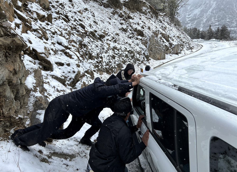 山路早已被連日的降雪掩埋,車輛綁著防滑鏈到達了山下,6名民警徒步向上攀爬近5公里,在零下25度的寒夜里,呼出的氣瞬間凝成冰晶附在睫毛上,手套凍硬如鐵殼,11點47分,通過無人機巡查和人工搜索,他們在一個大巖石后發現了被困者——體溫僅35.2度,意識開始模糊。“先把人救出去!”落桑旦增所長將自己的大衣全部裹在傷員身上,其余人抬著傷員一點一點走下雪山,并送去醫院救治,等回到所里,已是凌晨1點。