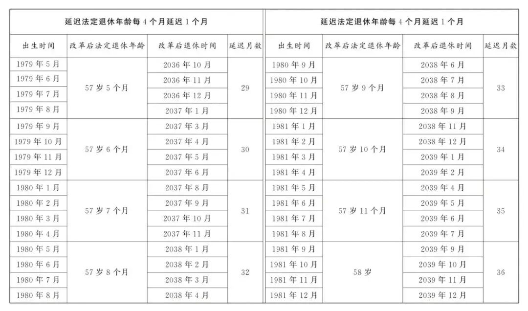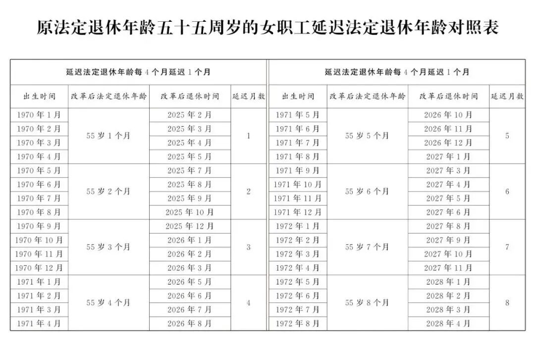 從2025年1月1日起,原法定退休年齡為五十五周歲的女職工法定退休年齡每四個月延遲一個月,逐步延遲至五十八周歲。
