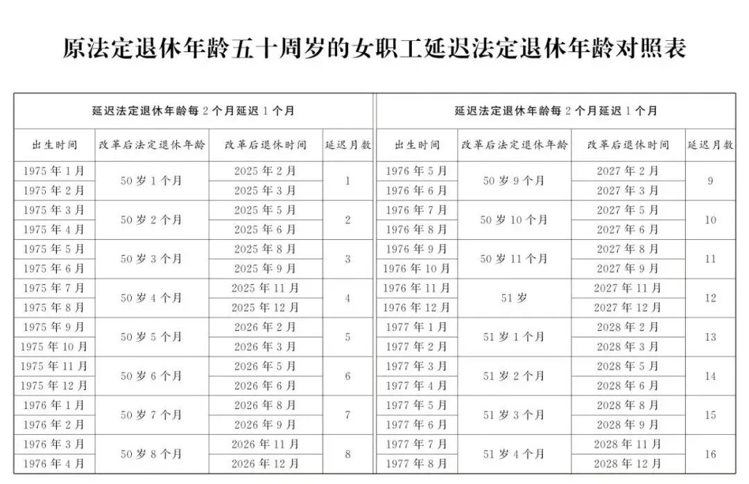 從2025年1月1日起,原法定退休年齡為五十周歲的女職工,法定退休年齡每二個月延遲一個月,逐步延遲至五十五周歲。