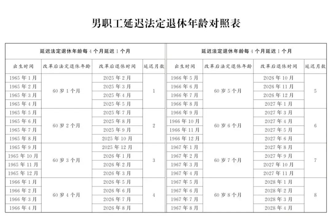 從2025年1月1日起,男職工法定退休年齡每四個月延遲一個月,逐步延遲至六十三周歲。