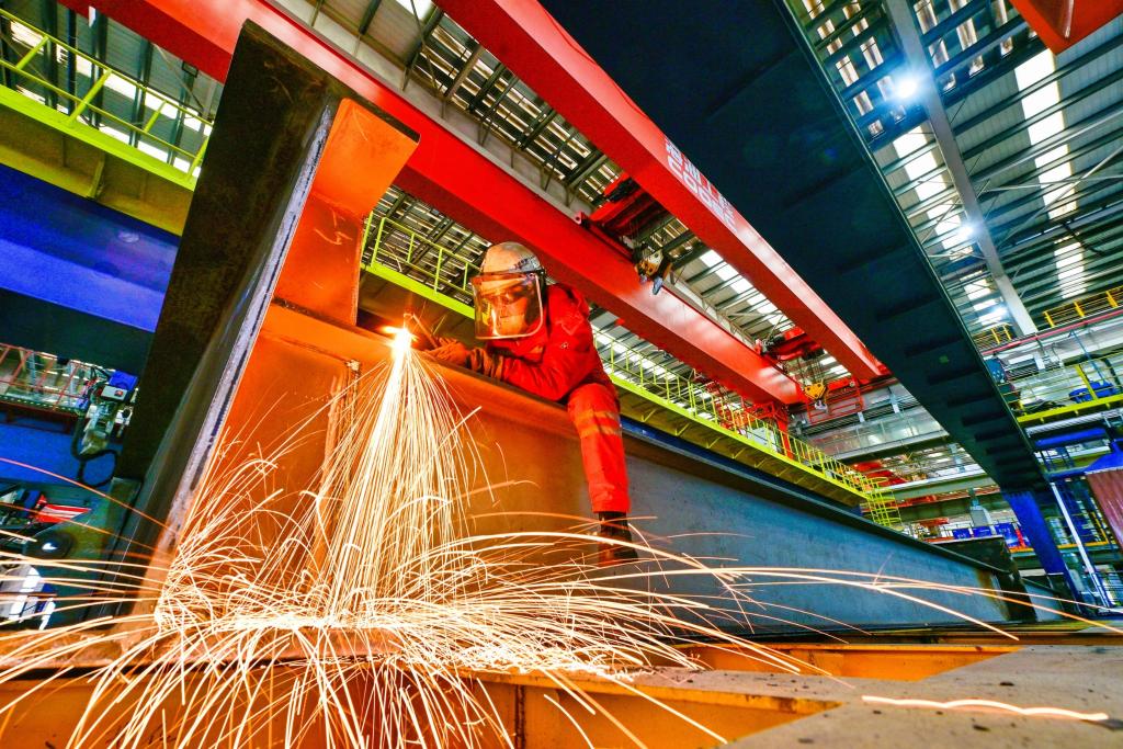 1月19日,在天津市濱海新區,海上油氣平臺建設工人進行氣割作業。新華社發(杜鵬輝攝)