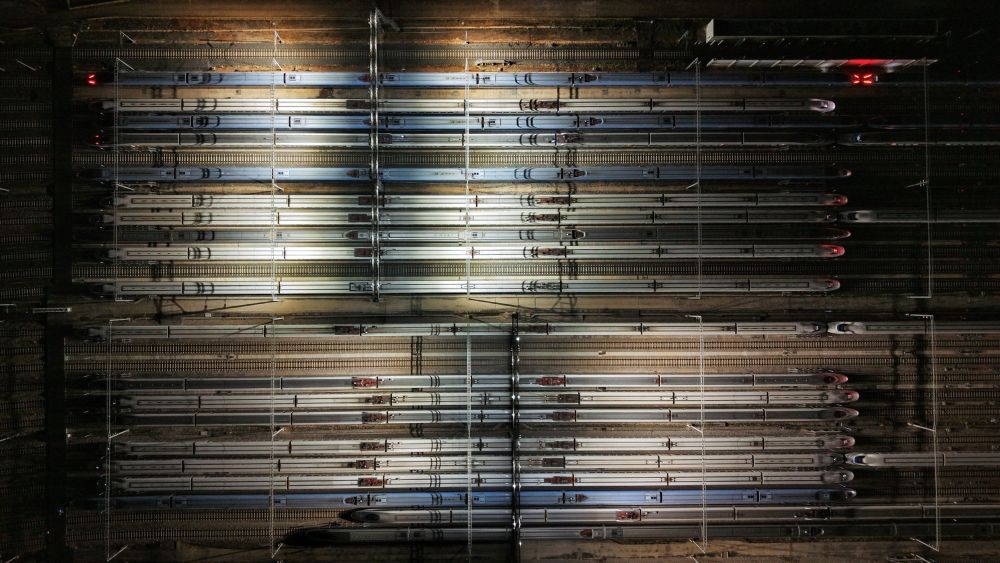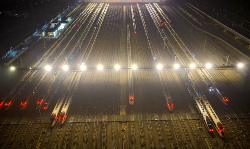 ↑ 這是1月25日凌晨在昆明車輛段昆明南動車運(yùn)用所拍攝的動車組列車(無人機(jī)照片)。新華社發(fā)(楊紫軒攝)
