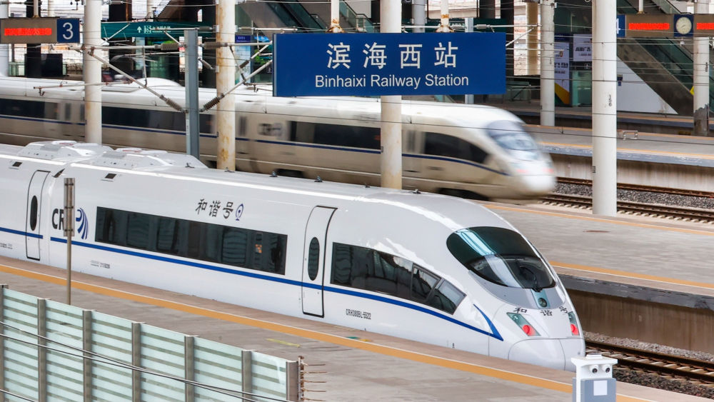 ↑ 1月25日,在天津市濱海新區(qū),動車組列車準(zhǔn)備駛出天津?yàn)I海西站。新華社發(fā)(杜鵬輝 攝)