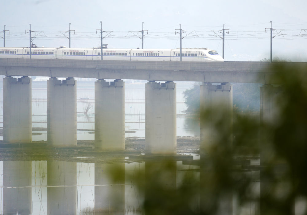 ↑ 1月25日,動車組列車在福建省廈門市境內(nèi)行駛。新華社發(fā)(曾德猛 攝)
