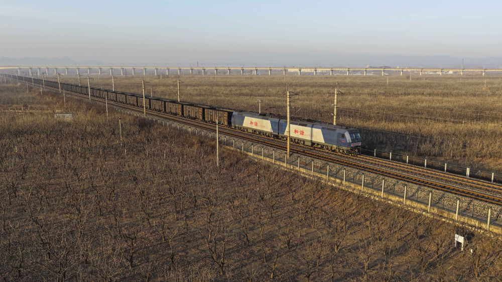 ↑ 1月25日,一列運(yùn)煤專列途經(jīng)大秦鐵路河北省遵化市境內(nèi)駛向秦皇島方向(無人機(jī)照片)。新華社發(fā)(劉滿倉 攝)