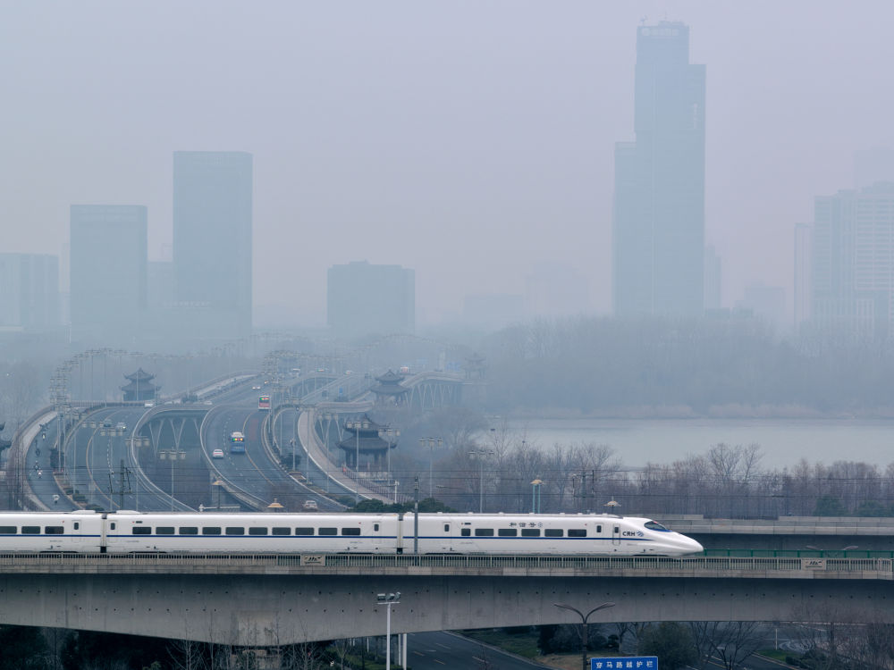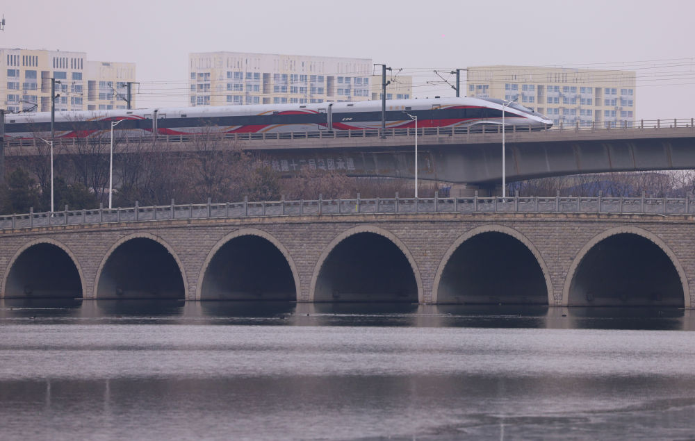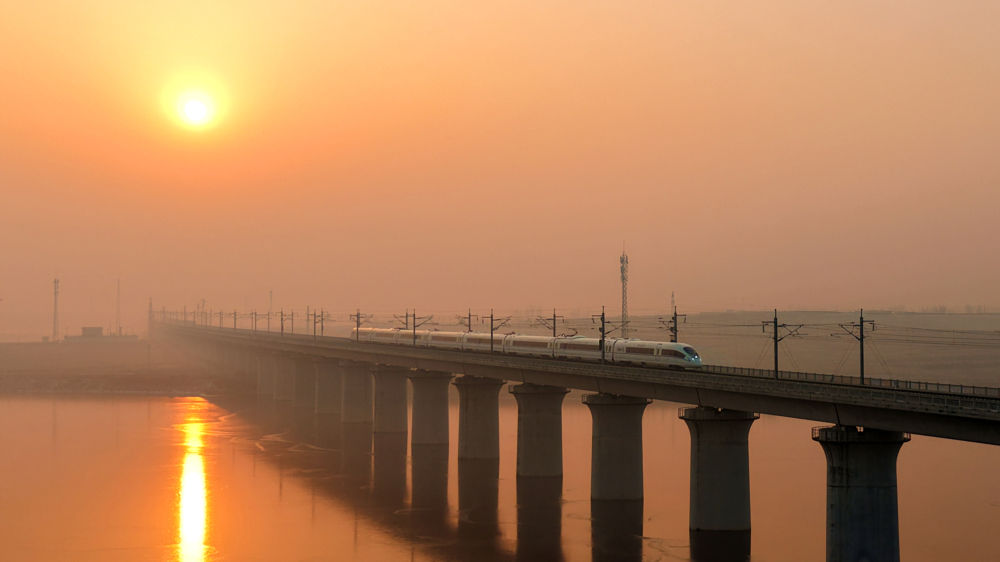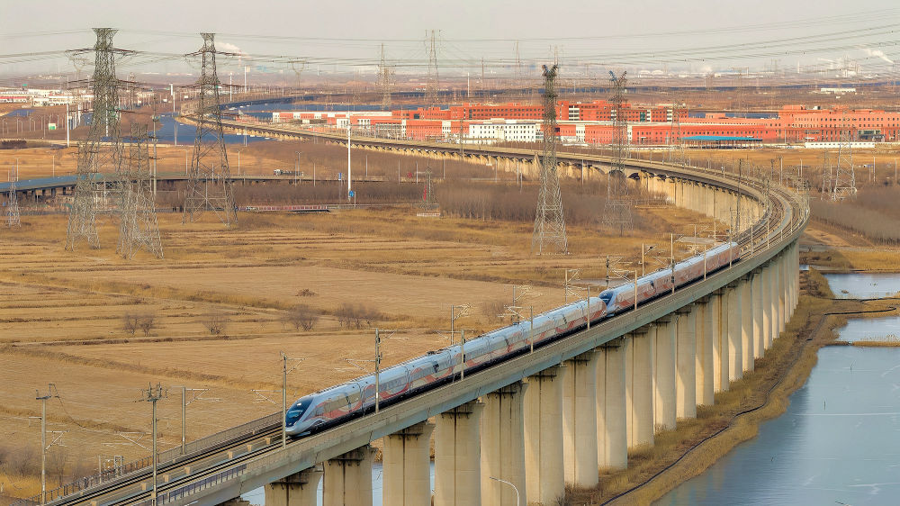 ↑ 1月25日,一列動車組列車在河北省石家莊市境內(nèi)行駛。新華社發(fā)(梁子棟 攝)