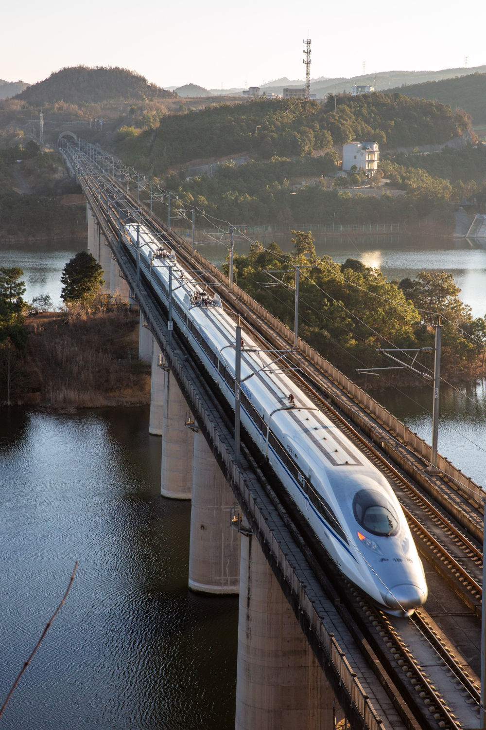 ↑ 1月25日,動車組列車從云南省曲靖市馬龍區(qū)舊縣街道車馬碧水庫上駛過。新華社發(fā)(楊俊鵬 攝)