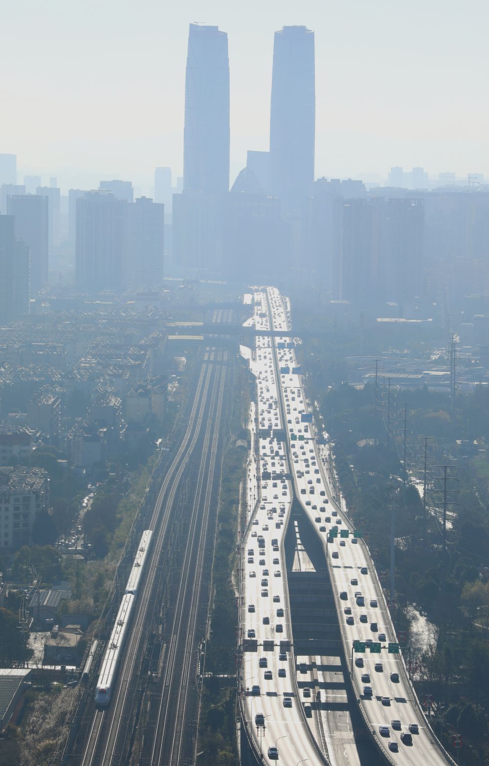 ↑ 1月25日,動車組列車穿行于云南昆明城區(qū)。新華社發(fā)(鄭益 攝)