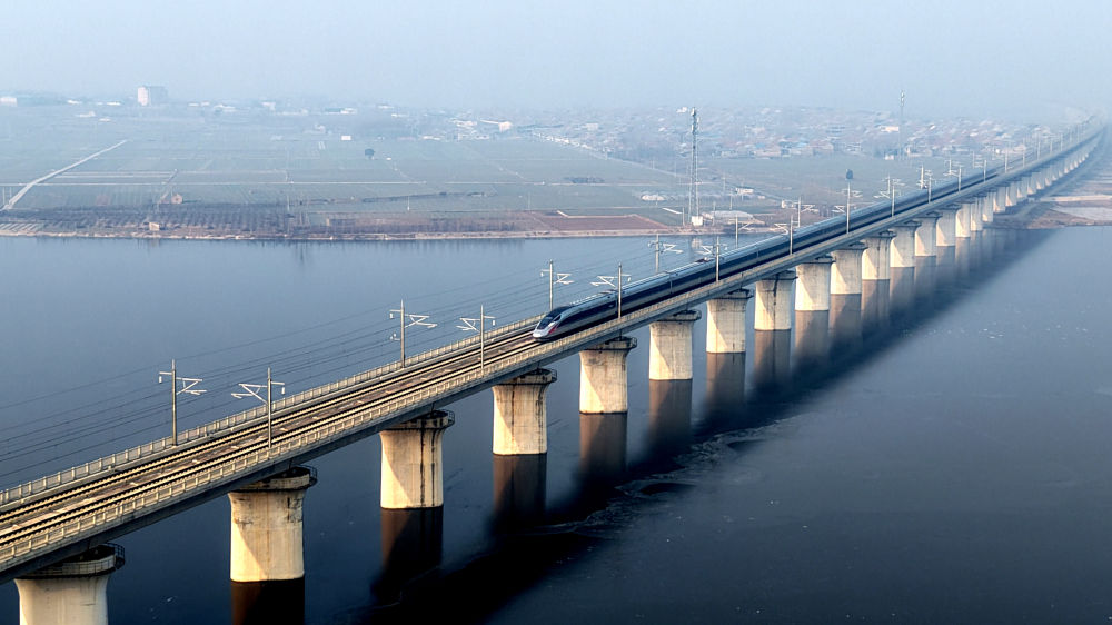 ↑ 1月25日,列車行駛在青榮城際鐵路山東煙臺段。新華社發(fā)(唐克 攝)