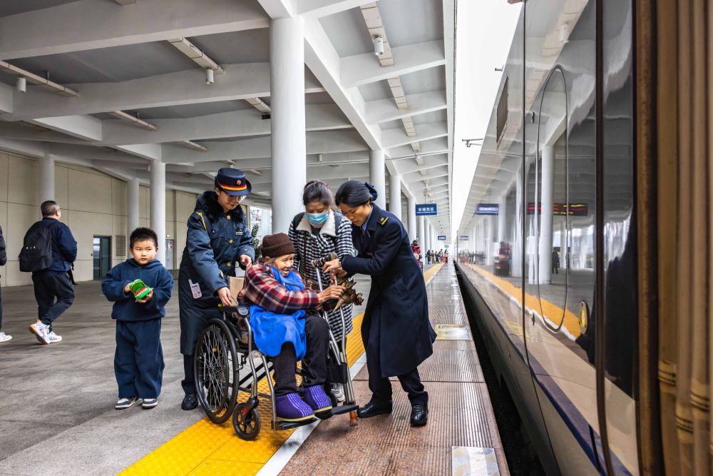 ↑ 1月25日,鐵路工作人員在貴州安順西站協(xié)助重點(diǎn)旅客乘車。新華社發(fā)(陳熙 攝)
