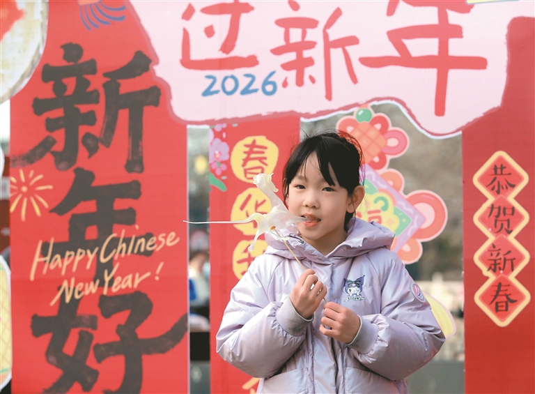 2月4日,在江蘇省揚州市錦旺社區“非遺迎新春”市集活動中,一名小朋友在品嘗糖人。新華社發(孟德龍 攝)