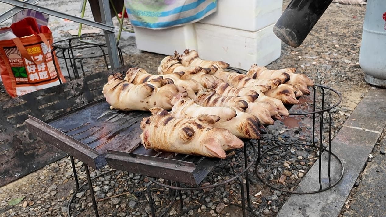 豬蹄攤位前,攤主王艷手持高溫噴槍,嫻熟地對著豬蹄反復炙烤。火光一閃,殘留的豬毛瞬間燎凈,表皮在高溫下逐漸褪去油脂,看起來焦黑锃亮,脆香入味。70歲的仉力民把剛買的四個豬蹄放進手拉車里,拿出手機看下一個菜要準備什么。今年的年夜飯,他要為全家24口人張羅12道菜,每個人的口味得兼顧,菜品的色香味得考慮,一家人聚在一起吃頓團圓飯,哪個菜都不能含糊,為此,仉力民和老伴奔走了沈陽周邊的多個大集。“過年在一起,就圖個團團圓圓”,魚、雞、鮑魚、螃蟹……仉力民年貨清單上的食材一樣樣備齊,拖著手拉車滿載而歸。