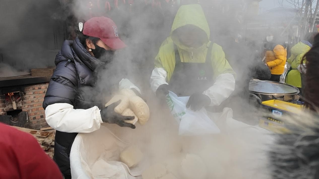 臨近中午,饅頭鋪前開始排起長龍。半斤左右的大饅頭,足有手掌大小,賣饅頭的朱海麻利地把燙手的饅頭快速裝進包裝袋,樂呵呵地跟老顧客閑聊幾句,年根歲末,生意好,心情更好。很多顧客都是多次回購,有從市區趕來,也有從外地趕來的,有的一下子就要買三五十個,留著過年慢慢吃。做饅頭用的小麥都是村里自己種的,蒸的時候用的是柴火灶,濃郁的麥香直往鼻子里鉆。“俺家這大饅頭,每個集都能賣出去5000個”,光想想這個數字,朱海心里都舒坦。