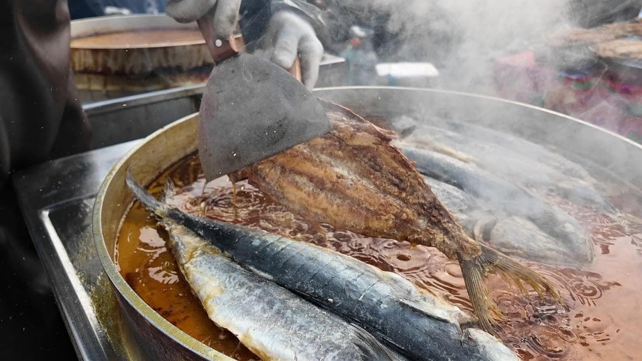 八點剛過,大集已經是一片熱火朝天。400多家攤位次第鋪開,一進大集,張美君的炸魚攤飄出的香味就讓人邁不動腿。香煎鲅魚、踏板魚、刀魚,最大的魚有近4斤重。張美君和家人做炸魚已經有14個年頭了,去年她把這份老手藝帶到了沈陽,生意也是一天比一天紅火。炸魚外酥里嫩的口感,讓她的回頭客越來越多。臨近春節,顧客更是絡繹不絕,為嘗一口鮮美的味道,也為討一個“年年有余”的好彩頭。