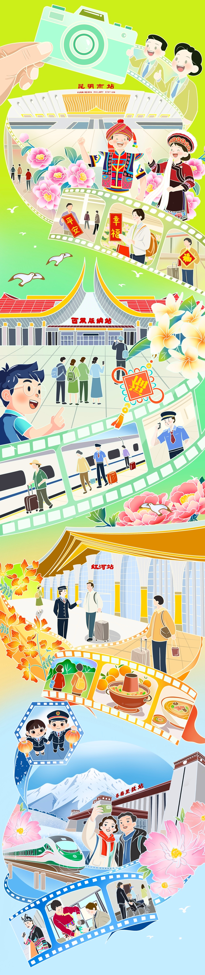 從花香滿徑的春城到熱浪涌動的傣鄉(xiāng),從果香四溢的滇南到雪山環(huán)抱的秘境,一趟趟列車穿越寒暑、串聯(lián)山海,讓旅客在旅程中盡覽云南四季風(fēng)光。山海交響間,平安溫馨相伴,多語服務(wù)、文旅指引、應(yīng)急護航、溫情幫扶……鐵路部門用暖心服務(wù)守護旅途,讓每一段歸途都平安順暢。