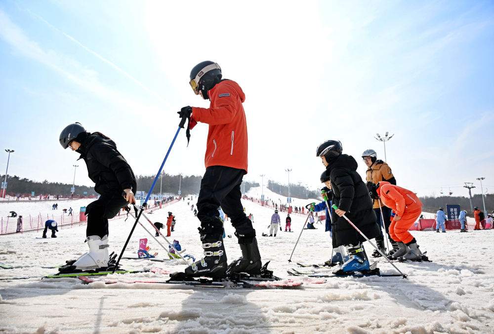 2月13日,游客在青島西海岸新區融創藏馬山滑雪場學習滑雪。當地以“冰雪+文化”“冰雪+旅游”聚人氣、促消費、添年味。新華社記者 李紫恒 攝