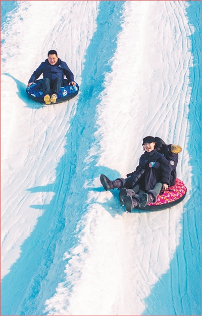 游客在江蘇宿遷市泗洪縣青陽街道游樂園體驗冰雪項目。