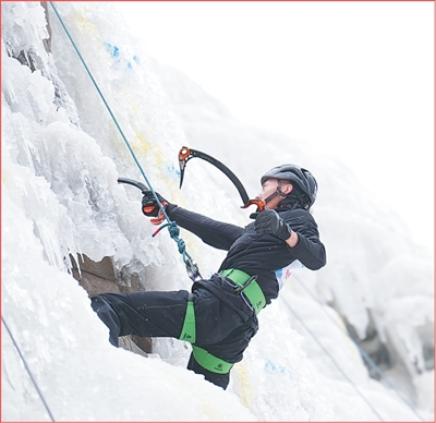 攀冰愛好者在青海西寧市湟源縣大黑溝旅游景區攀冰場內攀冰。