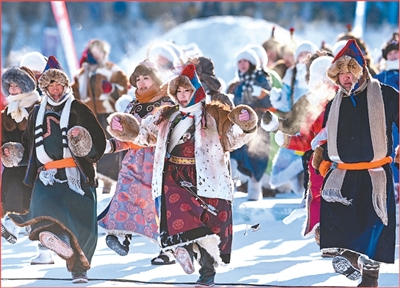 新疆昌吉回族自治州呼圖壁縣第六屆冰雪嘉年華現場,“姑娘追”表演正在進行。