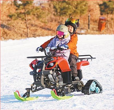 游客在河北唐山市玉田縣唐自頭鎮一家滑雪場體驗雪地摩托。