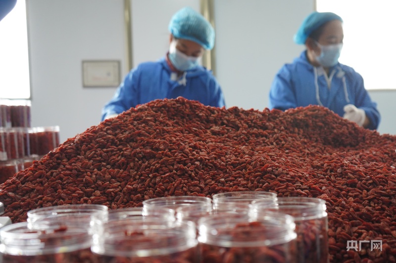 企業(yè)生產車間內,鮮紅的枸杞正在打包裝箱(央廣網記者 汪曉青 攝)