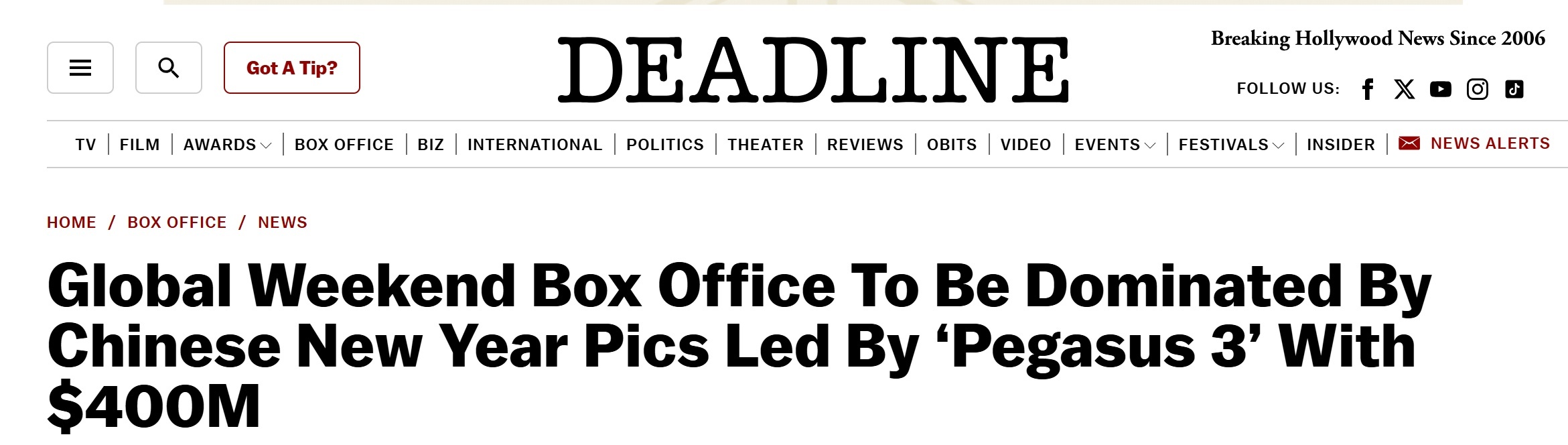 美國媒體“Deadline”網站報道截圖