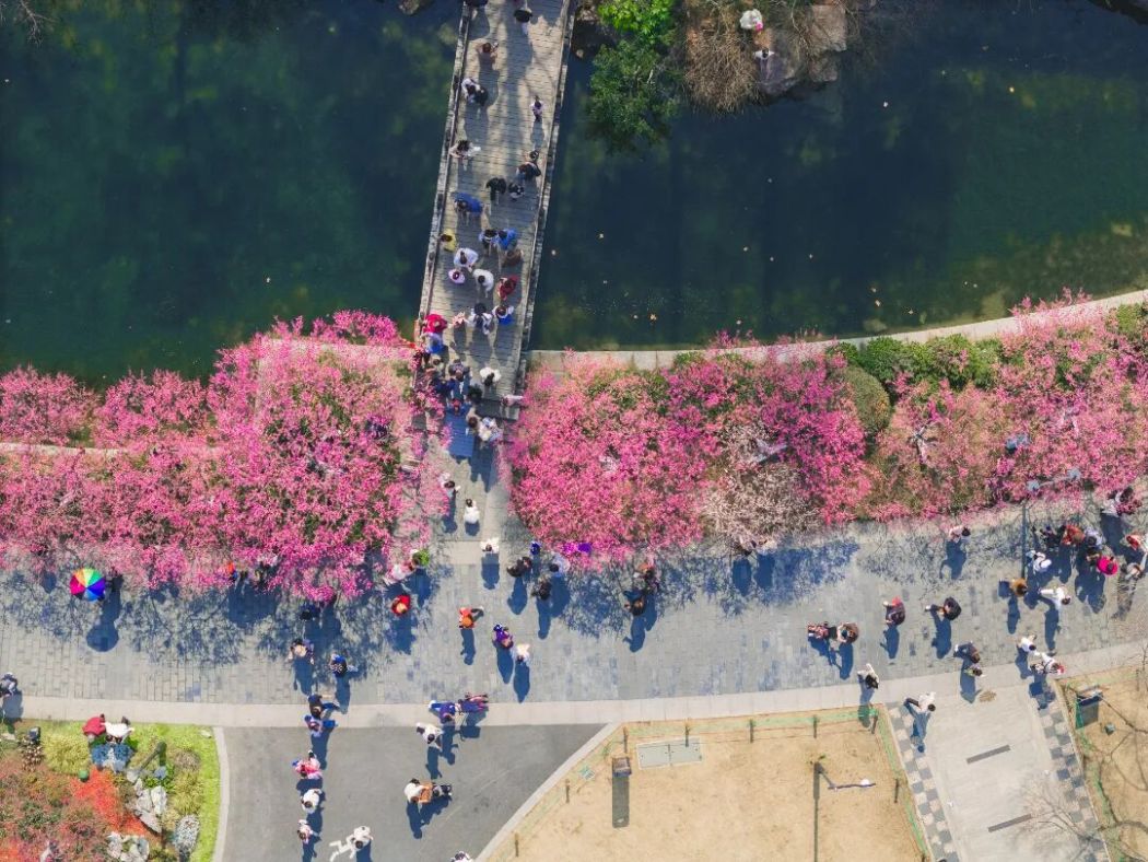 與常州遙相呼應,江城武漢的東湖梅園里,三萬余株梅花傲雪凌霜。梅香幽幽、沁人心脾,身著漢服的游客梅下留影,闔家出游的市民漫步賞梅,盡享團圓溫馨時光。紅燈籠點綴在紅白梅枝間,歡聲笑語漫過整個園區,將江城的年味渲染得熱氣騰騰。