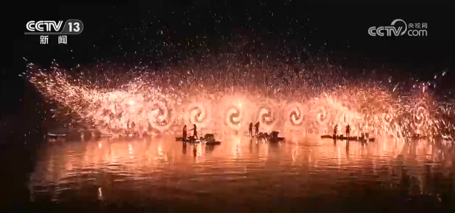 夜幕降臨,古城外的打鐵花表演震撼上演,表演者將滾燙的鐵水拋向空中,鐵水瞬間炸裂,金花四濺,如流星劃過夜空,引得現場喝彩聲此起彼伏。