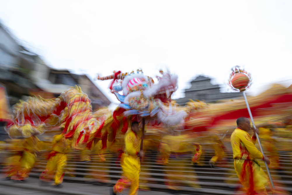 廣東中山游客王世杰一早便在大三巴牌坊前等著金龍?!盎洶奈幕嘟嗤ǎ贾v粵語、吃粵菜,都喜歡舞龍舞獅?!彼f,舞龍醒獅同臺獻瑞的傳統,把節日喜慶氛圍“推向更高”。