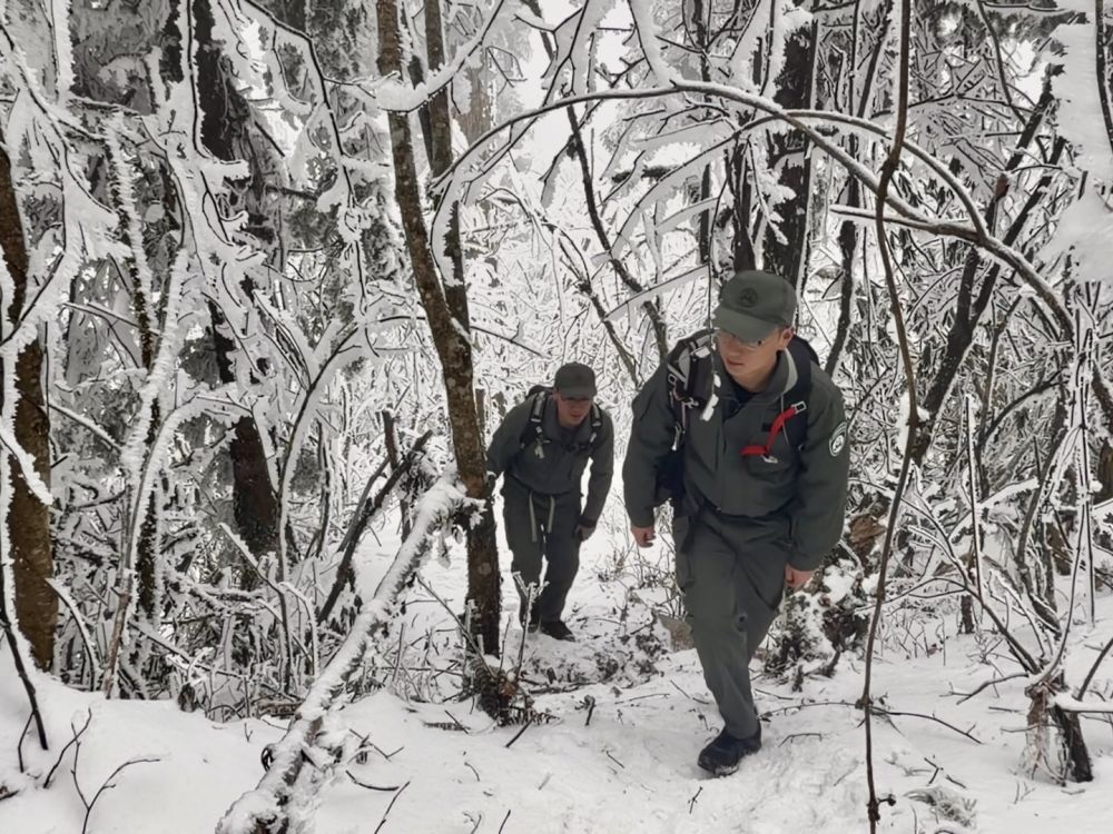 筒靴有點大,走起路來鞋底有些打滑,但踩進深深的雪地里確實不濕腳了。王偉已經在山里摸爬滾打了七年,毛軍剛入職一年,兩個人是巡山的“搭檔”。一人負責巡護,另一人則負責科研,是站里常見的組合。